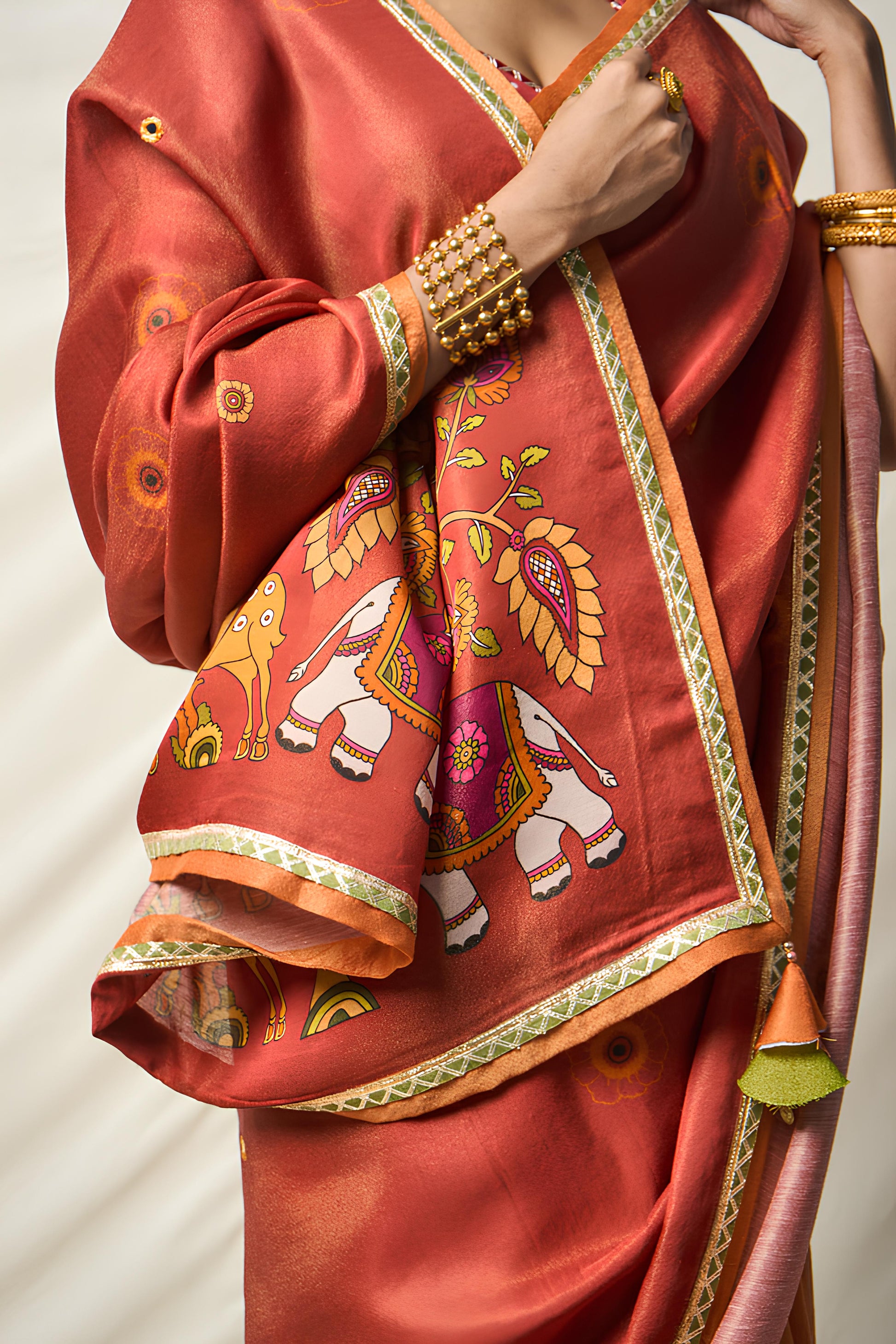 • Pattern: Metallic rust printed saree with hand dyed rust-orange patli. Saree has hand embroidered mirror work , gota lace edging and hand-sticthed tassels.