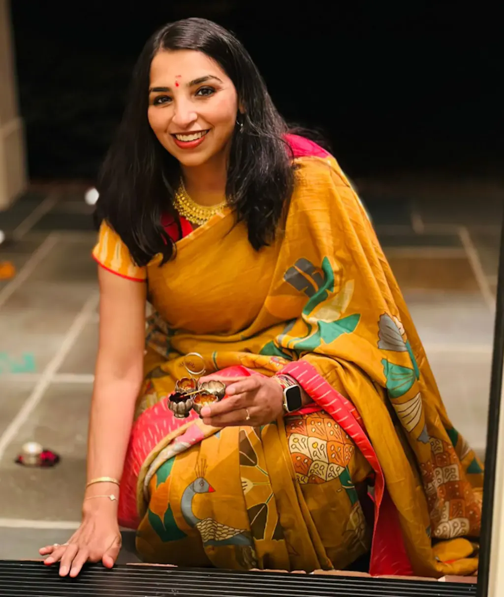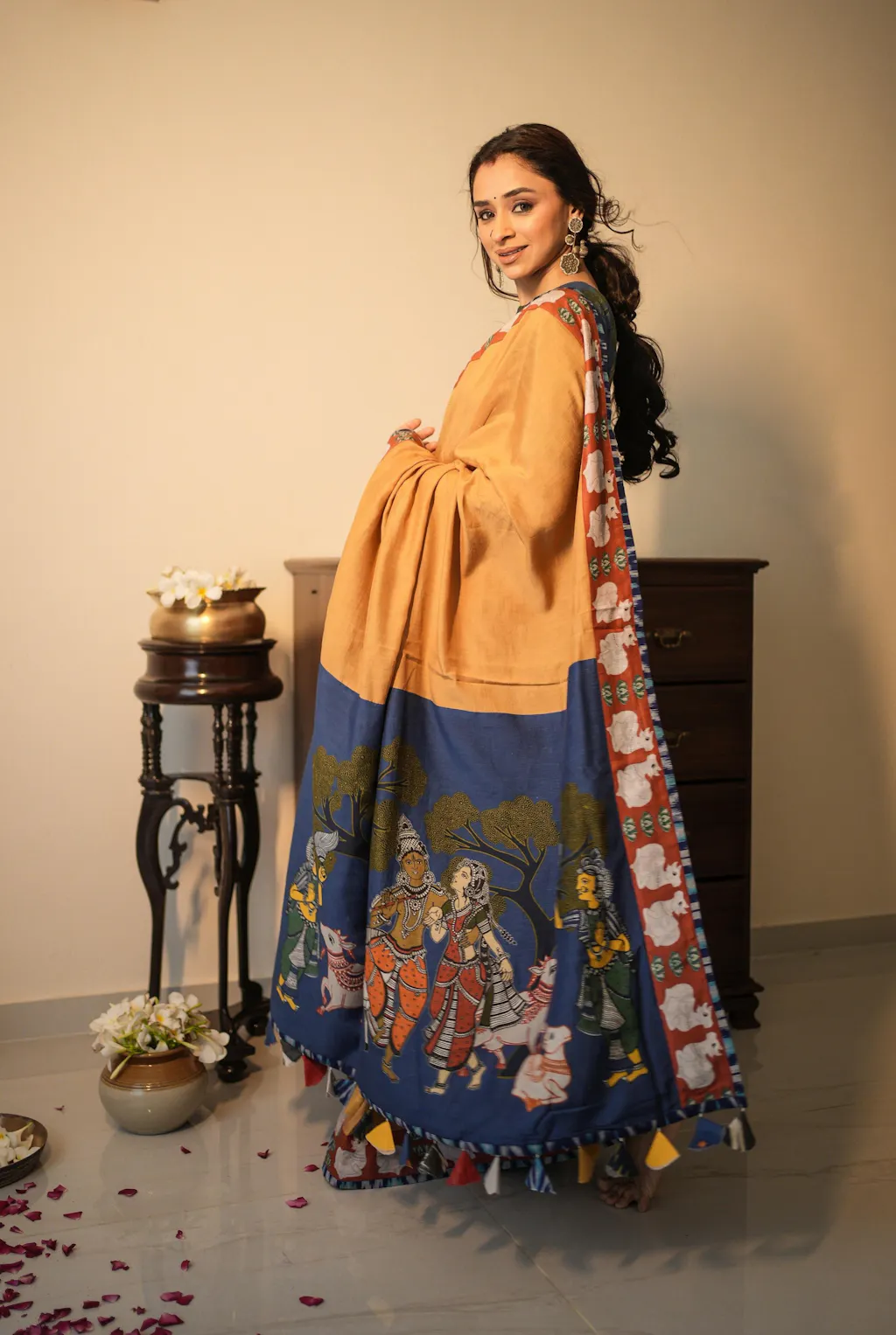 The moment I opened the Dhavali, I could feel how different it was — the fabric has this soft, effortless fall with a subtle sheen that looks even more beautiful in natural light. But what really makes it special is the storytelling. The delicate cow motifs along the border feel so thoughtful and rooted, almost like wearing a piece of Vrindavan with you.
